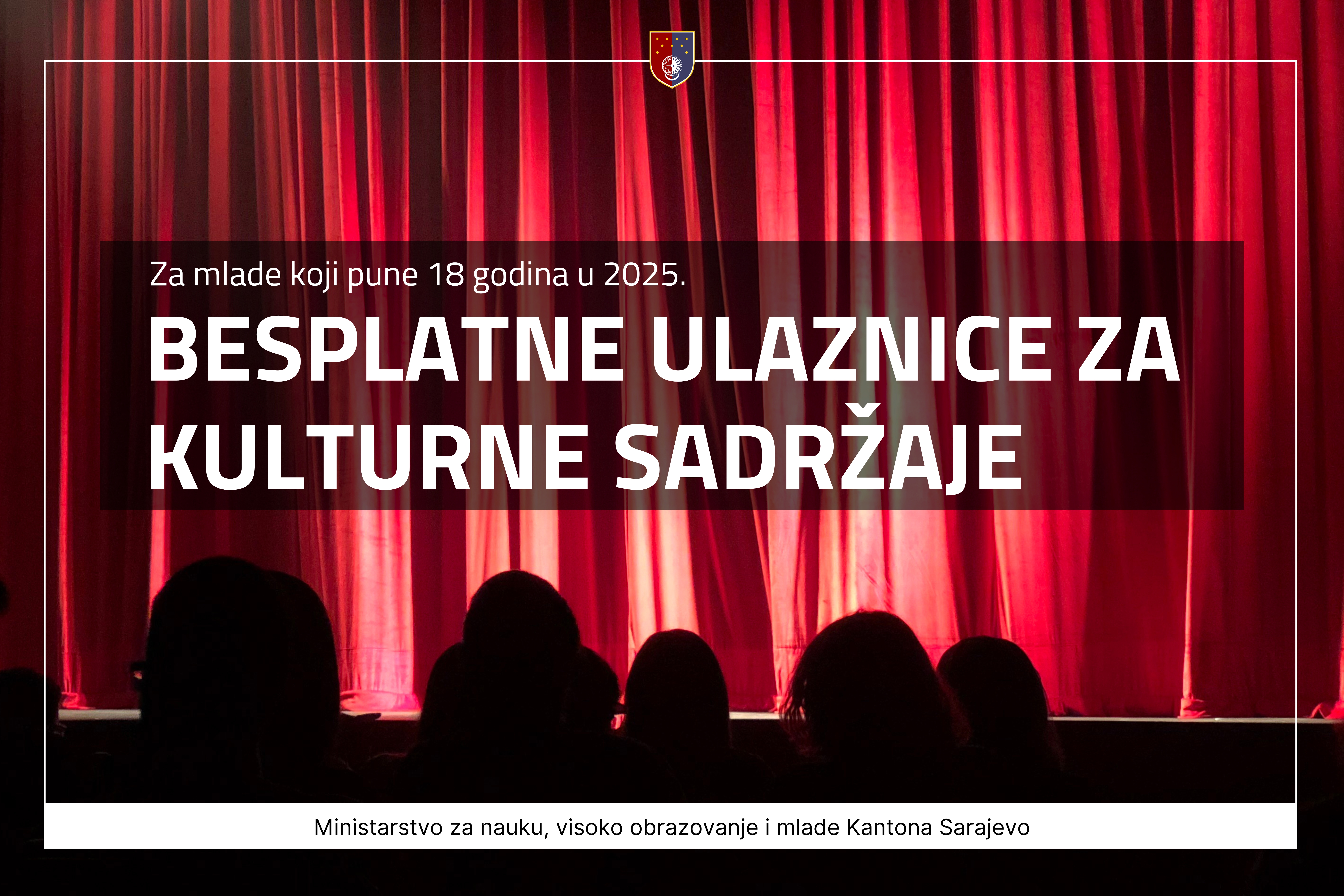 Ministarstvo za nauku, visoko obrazovanje i mlade Kantona Sarajevo poziva sve mlade koji su rođeni 2007. godine, koji ove godine navršavaju 18 godina i žive na području Kantona Sarajevo da se registruju putem WEB stranice Ministarstvo za nauku, visoko obrazovanje i mlade Kantona Sarajevo i ostvare pravo na osam besplatnih vaučera za kulturne sadržaje u sarajevskim pozorištima i muzejima. Besplatne vaučere možete iskoristiti u sljedećim institucijama kulture:
