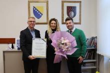 Dekan Farmaceutskog fakulteta Univerziteta u Sarajevu, prof. dr. Fahir Bečić, dekan i prof. dr. Tamer Bego, prodekan za međunarodnu saradnju Farmaceutskog fakulteta i koordinator IQPharm projekta uručili su zahvalnicu Ministarstvu za nauku, visoko obrazovanje i mlade Kantona Sarajevo i ministrici prof. dr. Adni Mesihović za partnersku podršku ovom projektu.