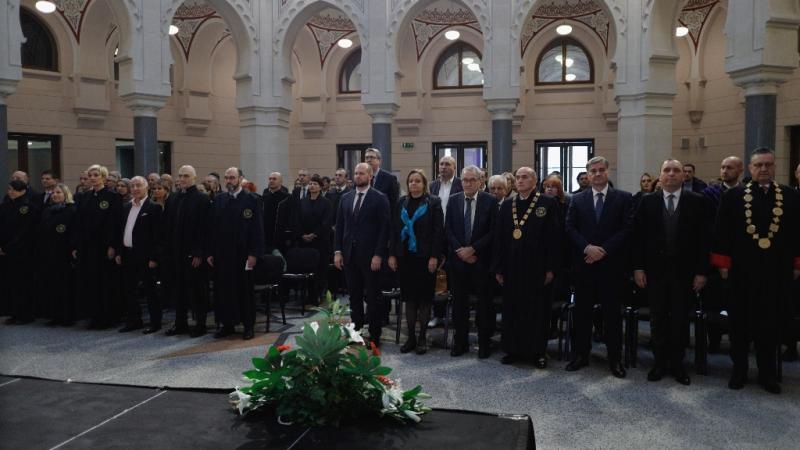 Na Svečanoj sjednici Senata Univerziteta u Sarajevu obratili su se akademik, prof.dr. Muris Čičić, predsjednik Akademije nauka i umjetnosti BiH, prof.dr. Zoran Tomić, rektor Sveučilišta u Mostaru u ime Rektorske konferencije/zbora BiH, Haris Bašić, zamjenik gradonačelnice Grada Sarajeva, predsjedavajući SKS Okerić, ministrica Nikolić i prof.dr. Denis Zvizdić, predsjedavajući Predstavničkog doma Parlamentarne skupštine BiH.